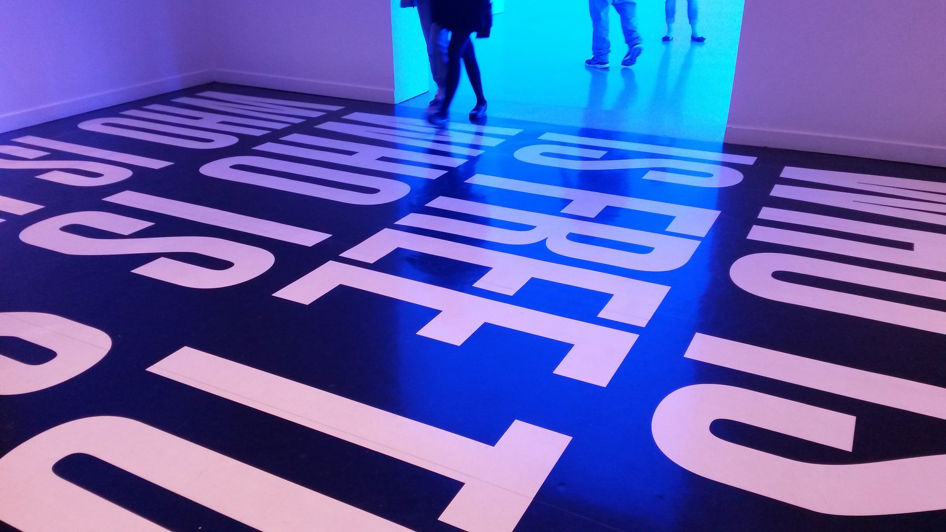 It speaks about architectural difference and boundaries. The sculpture-series recreates the architectural environment, it sets barriers making the room where the continuum is installed to appear as an infinite of the sculpture itself. And it creates a path in the space. The installation is composed of sculptural pieces varying in size and color. By using industrial, somewhat regular fluorescent lights to produce artwork, Flavin shows how minimalist materials create powerful propositions about our environments and public spaces. The power lies in it that the every-day contest enters the museum space. What is this about, who am I when I walk this path? And this light brings me to the next door with words on capital letters that speak louder than I’m used to.