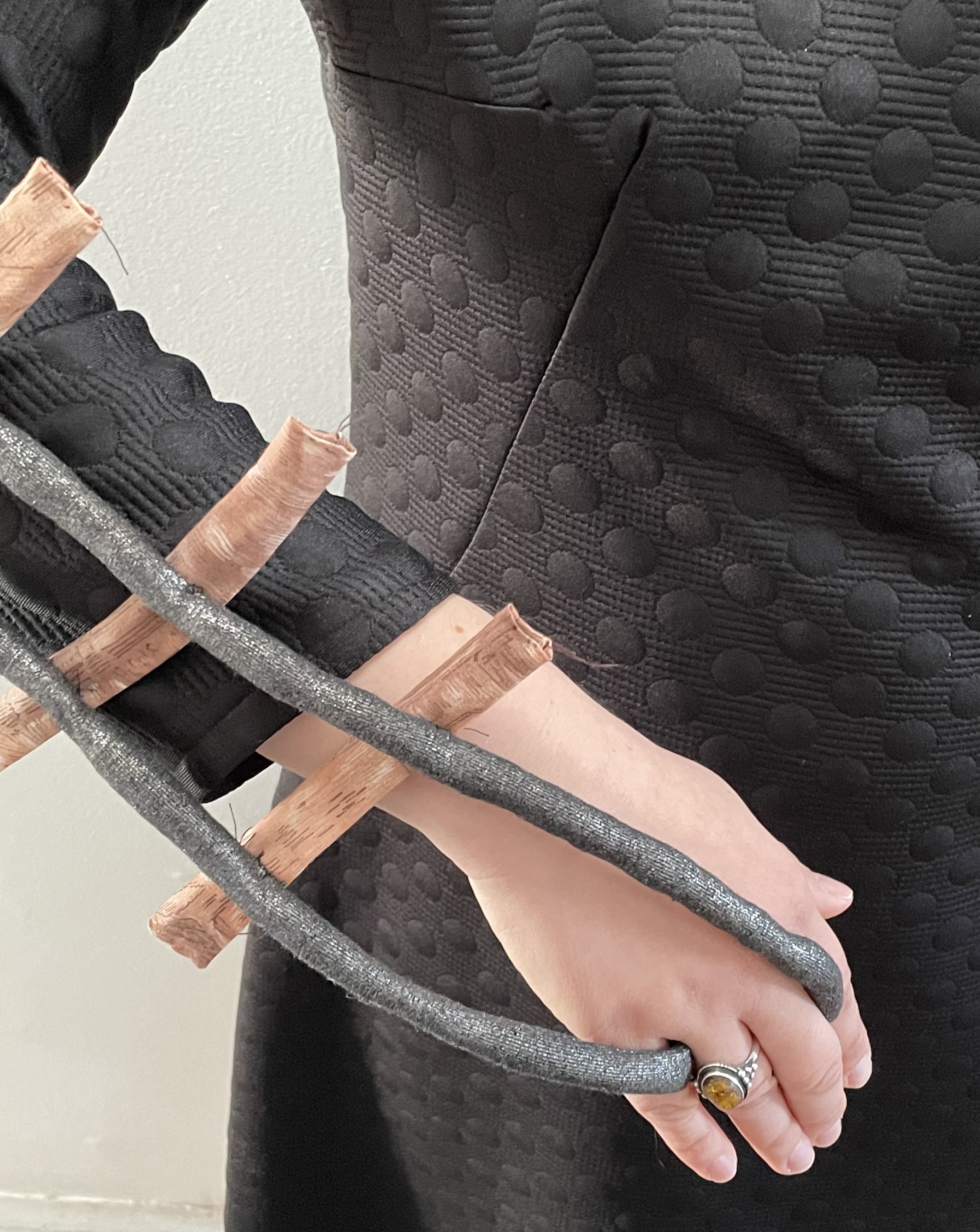 OJ: The fabric of this railroad dress, which I made, is polyfil and wood. It was inspired by the poem “Social Distancing” by Christine Turczyn published in Lightwood 4.
