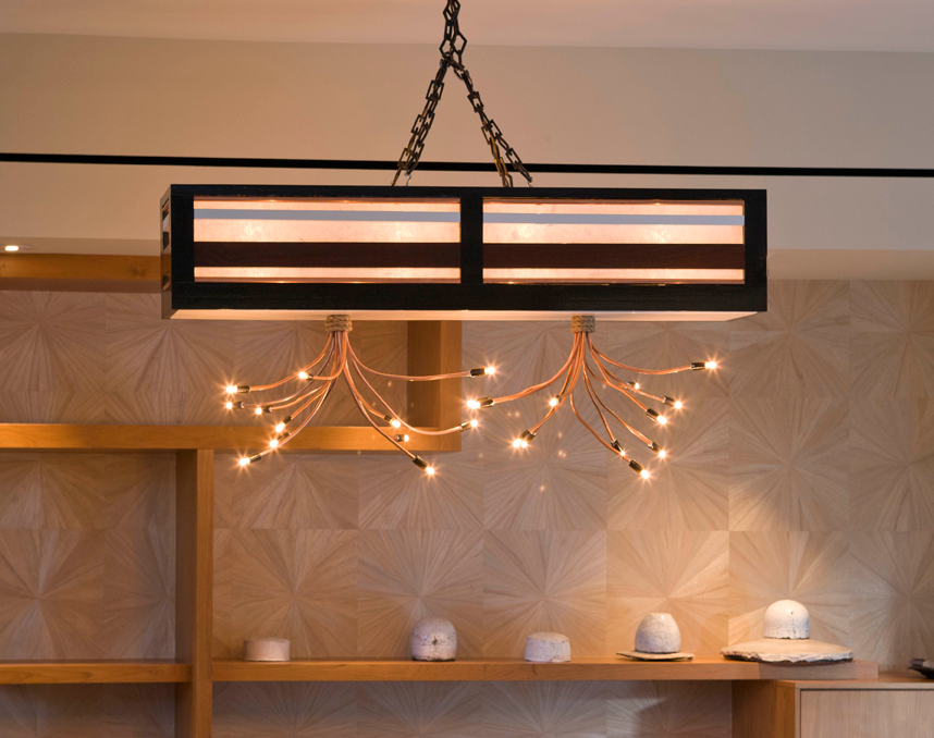 As of today, Robin has developed Light Designs. She is creating fixtures that come from the sculptural roots of using wood, copper and paper. Interesting ceiling lamps are the ones like an octopus or simply ‘branchy’ wired designs, which are light weighted structures for the ceiling. Ceiling lamp can contain one long rectangular design that has two branchy-designs attached to it, or it can be a smaller sculptural design having one wire inside them.