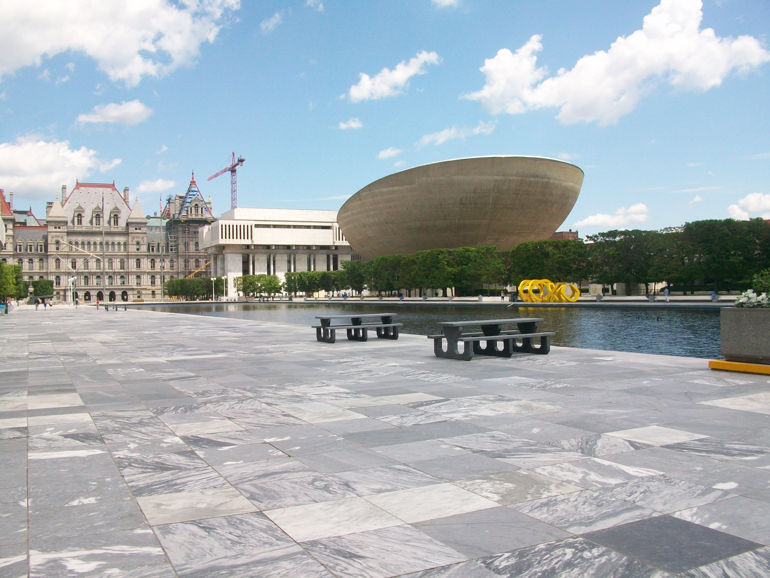 Democracy plays also with massive volume. It wants to show off. Former governor of NY Nelson Rockefeller commissioned a plan to elaborate Albany as a state capitol. Imagine a relatively small town in Upstate New York that has an appearance of a state capitol hosting democratic ideals in architecture. Such is the story of the Empire State Plaza.