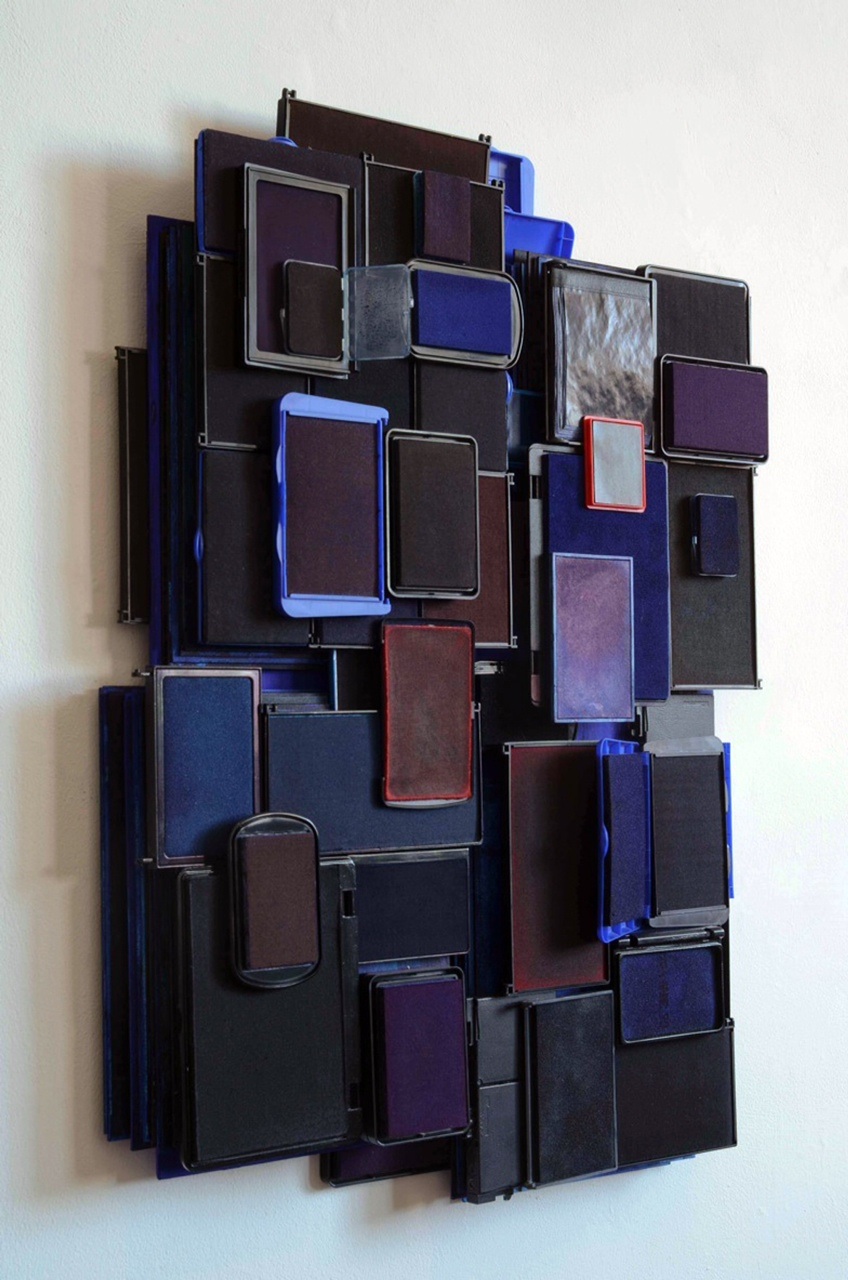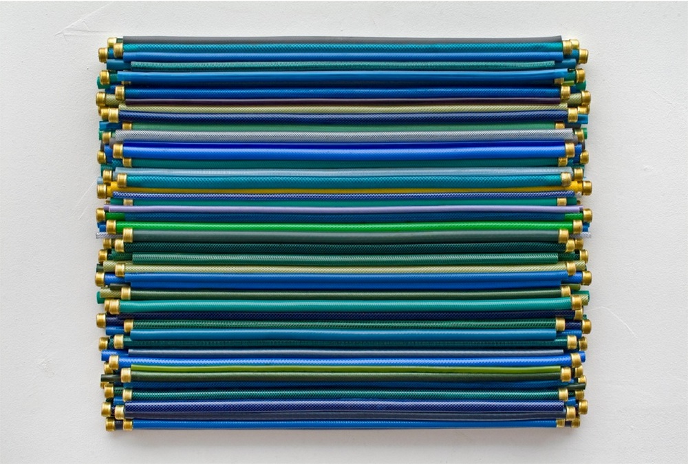 For his series Untitled, which was on display at VOLTA, Delasquez did meticulous hand cutting of individual strips of marine vinyl placing and accumulating them onto precut wooden forms.