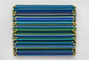 Artist Derrick Velasquez was presented at VOLTA by Philadelphia-based pentimenti Gallery. His marine vinyl and plywood wall pieces are sculptures, if you like, and at the same time they possess some qualities that are decorative, or design. Yet, this is not entirely summing up what he is doing with the ingredients. The art made by Derrick Velasquez is very physical. The layers of meaning, which come to your mind begins with words, like arts and crafts, ancient, poetics, mechanics, physics, installation, historical play with objects, and the body-art. He says in VOLTA NY 2013 introduction to his work, that his attempt is to ‘construct a language of structure that questions our physical and psychological interactions with industrially manufactured materials that exits in the spaces we inhabit’. Velasquez works with plywood to investigate the gravity or tension on the wood together with the materials of marine vinyl, acrylic and hardwoods. He adds into these the human body dimension. When the body is part of the picture; questions, how the wood can be stretched to measure our physicality, and what is a relationship between the space, the materials used and the body, are relevant. All these questions are also important in design. While his art looks very organic and natural, it also comprises qualities of forced, structured and compressed; so the tension is created.