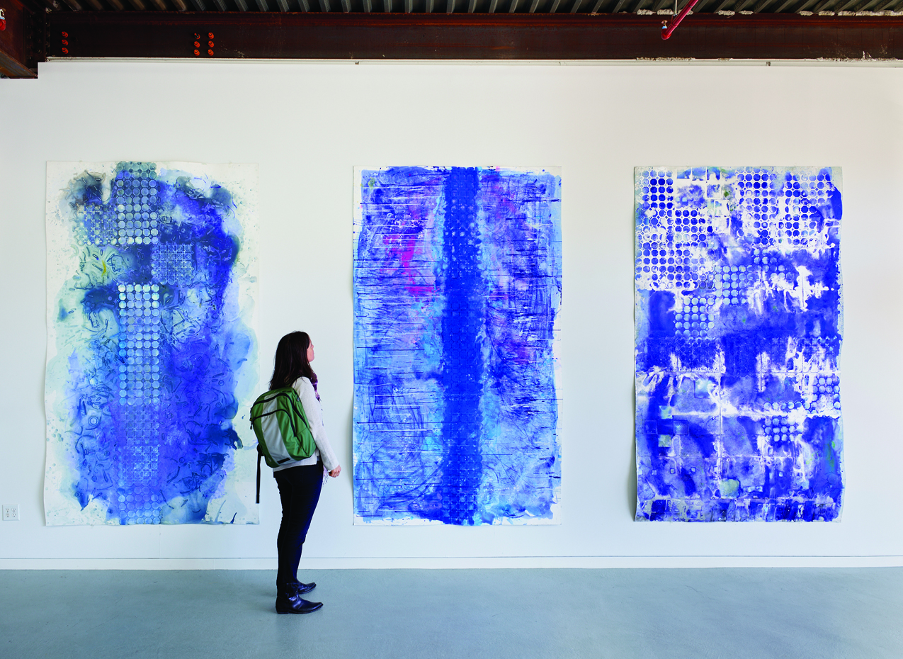 Ellen Hackl Fagan Studio view. Seeking the Sound of Cobalt Blue, Big Blue, 2020, pigment, acrylic, museum board, FV, 108 x 60 in.