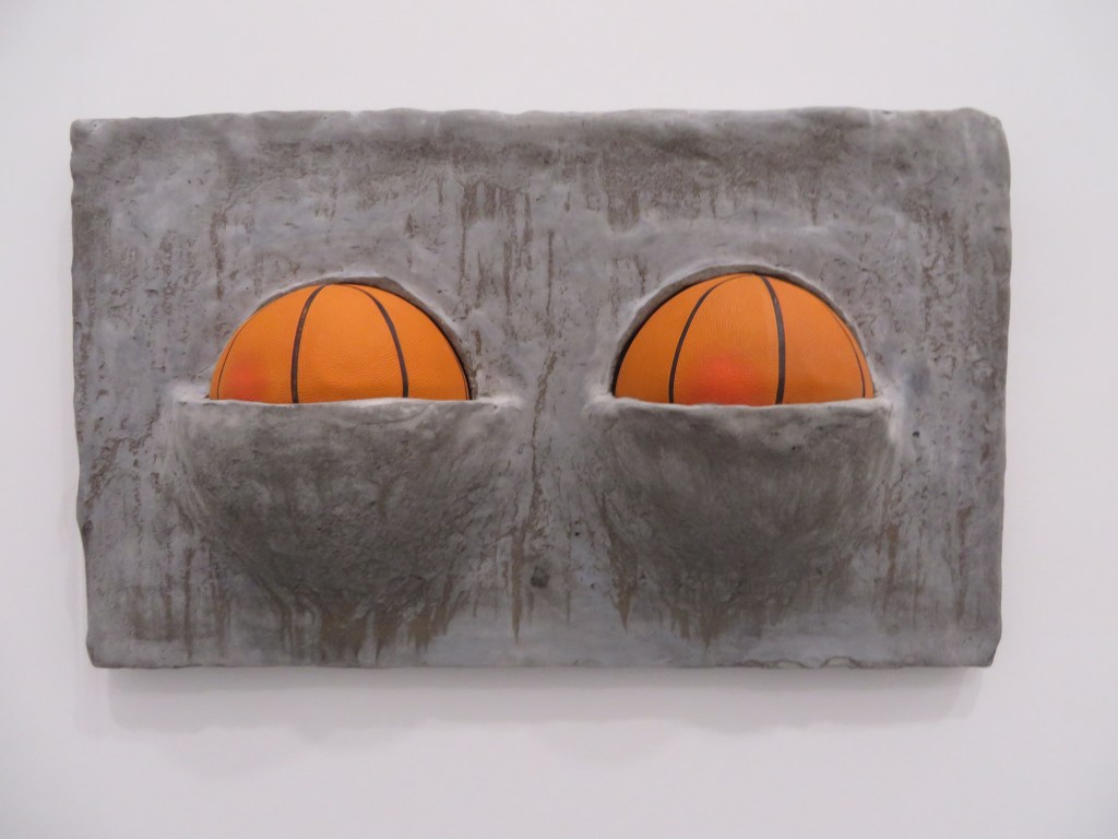 Galeria Fortes Vilaça from São Paulo presented Erica Verzutti’s concrete sculptures that were academic and playful at the same time. The gallery commented that Verzutti’s works gained a lot of attention at the Frieze art fair, due to their brilliant interactive quality, and sense of humor. The sculptures are semantically pointing to archeological pasts, many of them depicting minerals and natural stones that appear as traces of nature. Playfulness comes from the interactive quality of her sculptures, some parts are loose (like egg-shape stones) and can be organized differently. Double Sunset is a bit different from her other works, some of them on stands. The work on the wall showcases two basketballs as a colorful urban signifier of play and sports, when they are installed in the concrete. But ultimately the viewer has a chance for interpretation. A woman’s bust, femininity paraded?