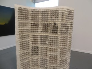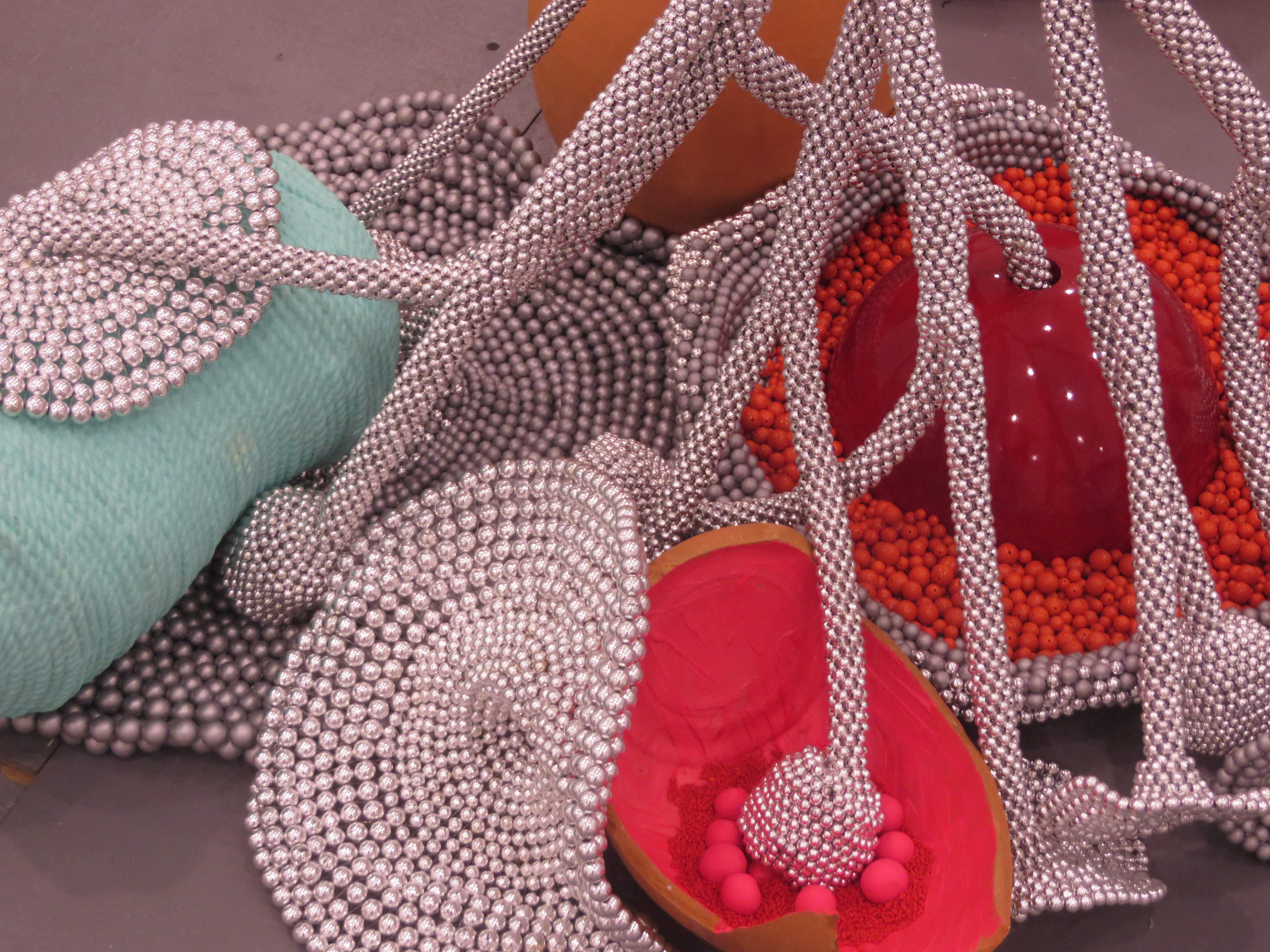 Sensations attached to the materiality in sculptures relate to ideas of tactility (perceptible to the touch; tangible). Our experiences of materiality has shifted, as 21-century cultural landscapes keep molding our tactility through complex body-digital technology relationships, changing our imagination of the virtual spaces. Contemporary sculpture is reflecting some of these shifts, showing powerfully the time beyond the current, the moment at hand. Among some of the interventions, Frieze 2014in New York City paraded a loss of the technological overrule. The disengagement from materiality at large, was shown in some works. There were works that were pointing to our roots of craftsmanship, bringing back materiality of different scales, and putting out the new spatial engagements. Noteworthy is that large scale is not necessarily the most powerful signifier, but some minimal portions or material may also integrate ideas. An example of this kind was installation with smaller details and nuances by artist Maria Nepomuceno. The artist was presented at Frieze NYC by AGentil Carioca‘s Gallery from Rio de Janeiro.