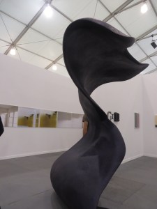 Respectively, Liz Larner’s sculpture spoke from the Frieze exhibition of Los Angeles based gallery Regen Projects. Her bold sculpture was physically large and airy at the same time. A free-standing metal sculpture displays a cold aesthetic. Her sculpture “V (planchette)” (2014) has a smooth aluminum surface, which is painted a chalky black. It is curvy suggesting motion, giving feelings according to the angle it is viewed from. It is wider at its base, leaner in the middle, large and flowing at the top. The statuesque nature promises balance, but gives a hint of character that might be leading to odd and ambiguous places.