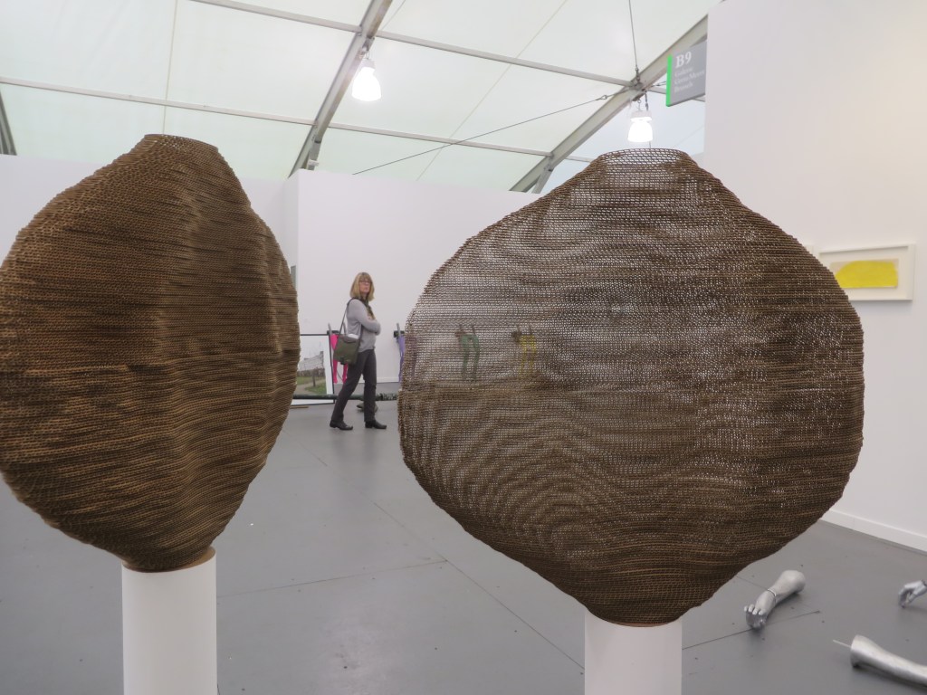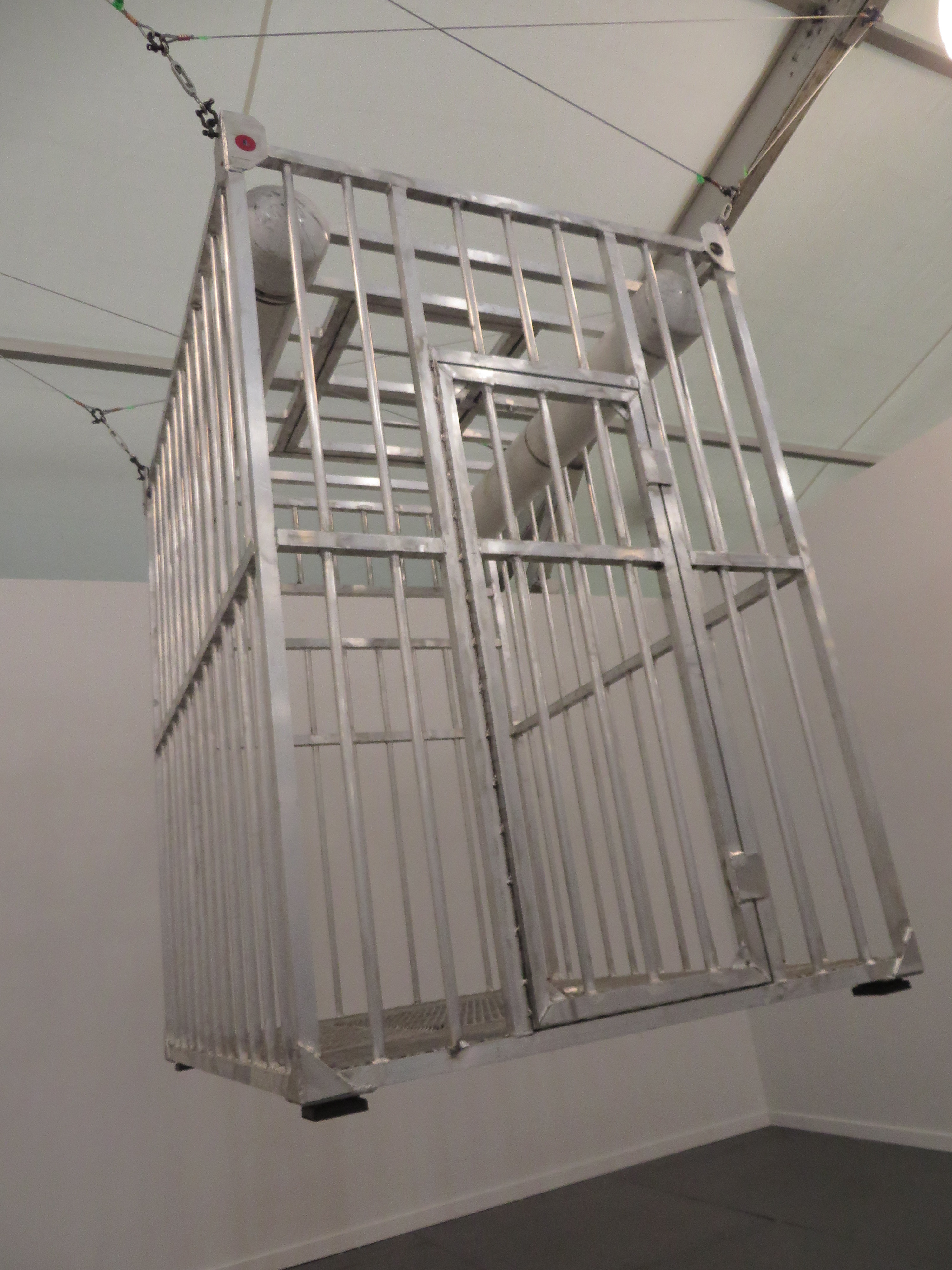 One show-stopper at Frieze was a pale installation composed of a single cage, which was hanging from the ceiling with nothing around it but the white walls. Wilfredo Prieto was the artist curated by Nogueras Blanchard galleryfrom Barcelona. It evidantly showed how to be captured, a sentiment so fearful, yet potentially something that makes art appealing to its viewers. The possibilities are endless to imagine how to relate to the cage as an object, to think what are the experiences and feelings attached to its awful shape. It represents zoo-like ready-made feelings, and it reminds of a consumer-object relationship without pointing to a specific direct target, except the art fair itself? Who would need a shark-cage? Who needs this kind of art? A question, what are the sensations attached to our art-viewing, comes to mind. Is art made for humans as animals? Weird crescendo of concepts makes it art?